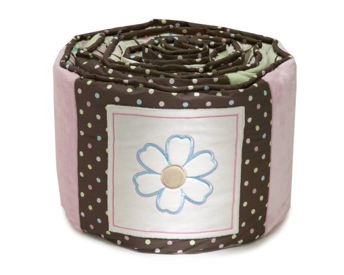 Bumper: Pink, green, white and chocolate brown patchwork. 100% cotton. Ties on each corner and 5 ties along the top. Measures 11"H.